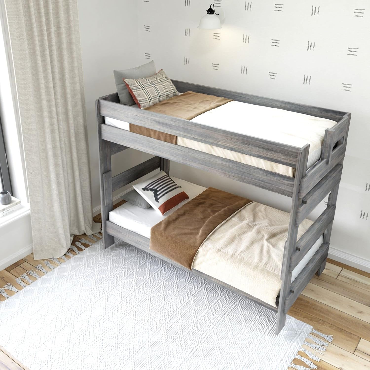 Modern style, farmhouse elegance. Our Rustic Twin XL over Queen Bunk Bed’s chic aesthetic coordinates with your space for a country-contemporary look. Its stacked design maximizes the space in your room. Crafted with solid New Zealand pine wood and durable, low VOC finishes to beautifully match your clean and healthy home. Its rustic, neutral color finishes and color-matched hardware pair with any design and decor. Solid plywood slat roll and metal support bar provide support for up to 400 lbs per sleeping surface. Your dream space, elevated.