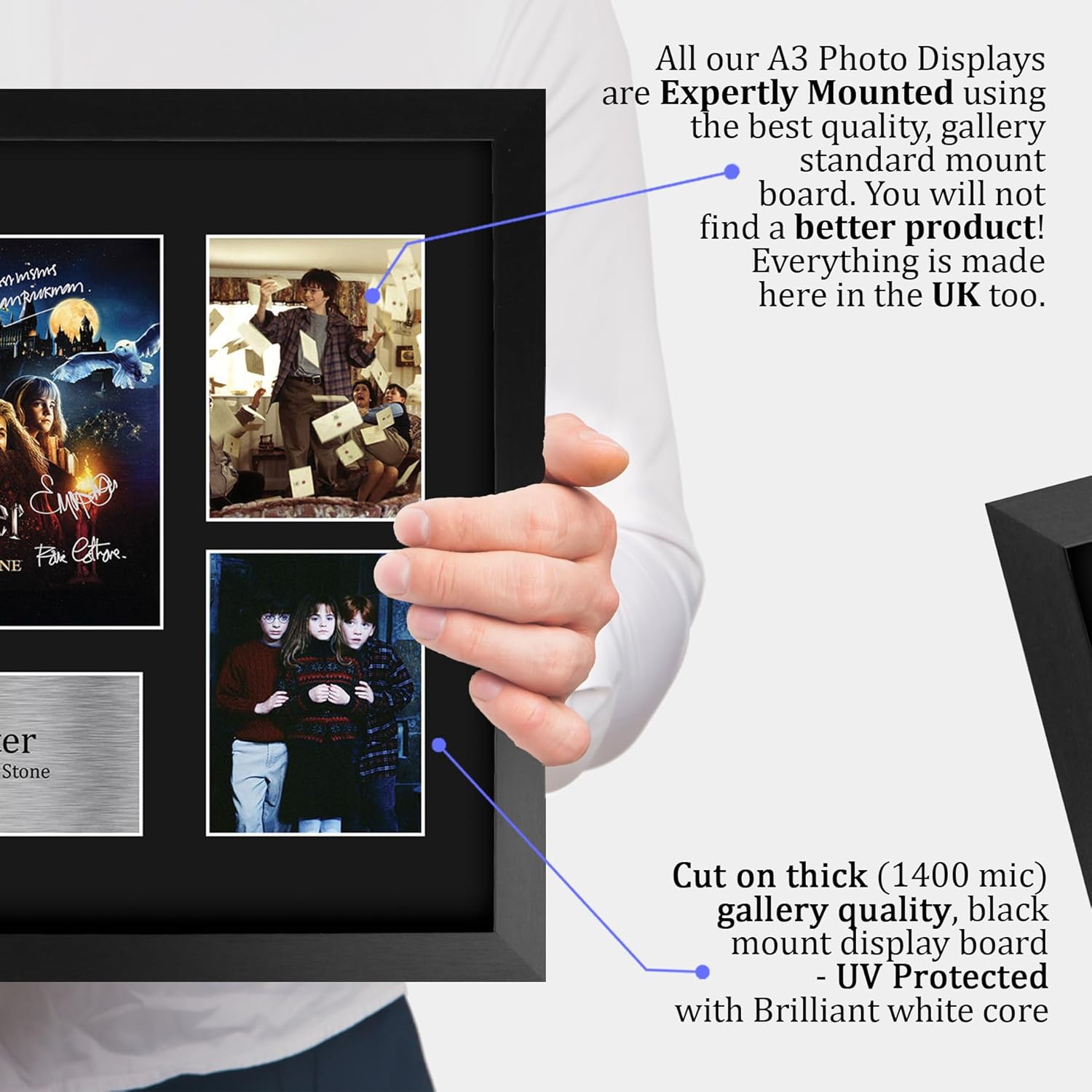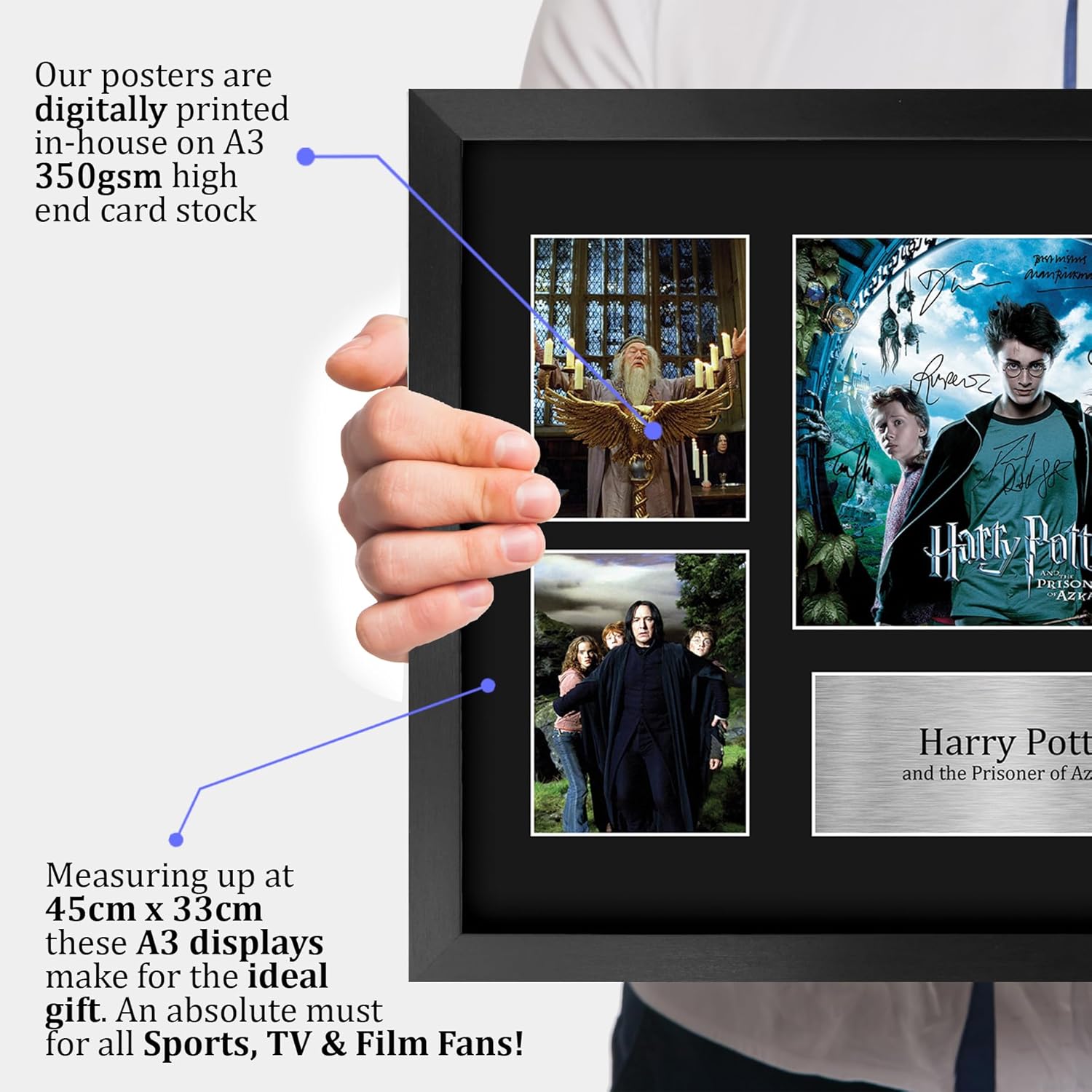 Professionally made in our studio, this framed Order of the Phoenix - Harry Potter The Cast display comes with a high-quality poster style picture with printed copies of the stars famous autograph signature. Framed and mounted in a matt black using an acid-free display board an framed a sleek black Polycarbonate frame which compliments the matt mount display perfectly. Lightweight, but of the highest quality, these make the ideal Christmas/Birthday gift for fans of all ages, and best of all, it definitely won't break the bank!