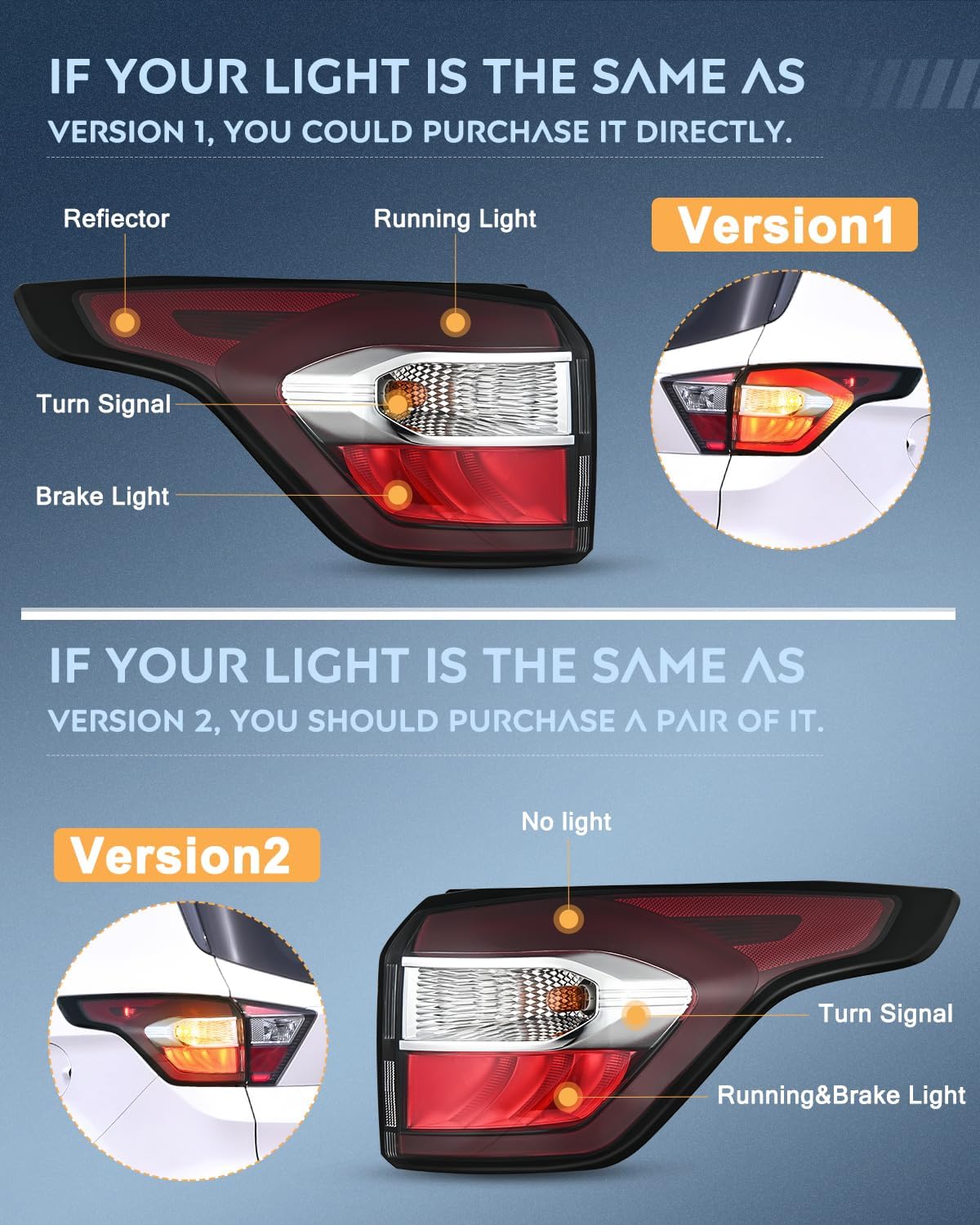 • Compatibility: The taillight assemblies are compatible with 2017 2018 2019 Ford Escape Kuga. Please confirm the vehicle fitment before ordering. OEM Part Number: GJ5Z-13405-C, GJ5Z-13404-C.