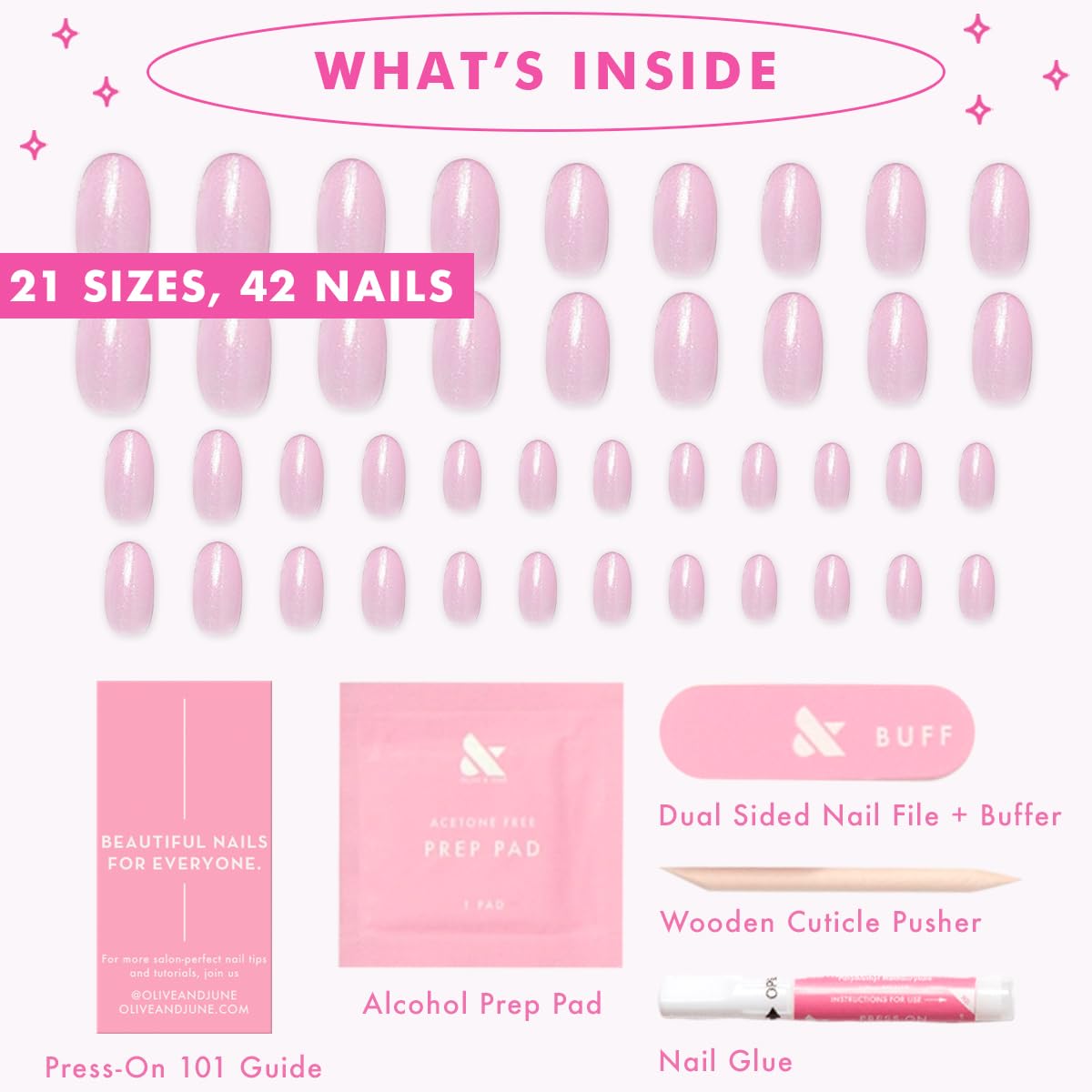 Meet the realest-looking fake nails you’ve ever seen in all your favorite shades, styles, and shapes with the Olive & June Glue Press-On Bestsellers Kit—featuring four of our most-loved press-on nail styles in one effortless, ready-to-wear bundle. Designed to deliver the realest-looking fake nails with a fit that feels custom, this set brings the salon to your fingertips in minutes. This kit includes: HD XXS Round: Crisp true white in an effortless shape and length Classic French Short Squoval: Timeless, elegant, and always on trend Shimmery Super Star XS Squoval: Sparkly and soft for a subtle celestial pop BP Medium Almond: A classic icy pastel blue Each set is crafted from up to 94% recycled materials in all your favorite Olive & June shades. With a variety of lengths (Extra Extra Short, Extra Short, Short, Medium), you’re sure to find your perfect style and fit. Our non-damaging glue gives you up to 14 days of strong, comfortable wear, all while protecting the health of your natural nails. Whether you're new to press-ons or a seasoned pro, application is quick and simple. Just push back your cuticles, buff and prep your nails, apply glue to both your natural and press-on nail, then press and hold for 30 seconds. You’re done—in under 10 minutes. From simple and minimal to shimmery and sparkly, the Glue Press-On Bestsellers Kit gives you a salon-fresh look with zero drying time, damage, or hassle. These are nails that look real, wear beautifully, and work with your lifestyle—not against it.